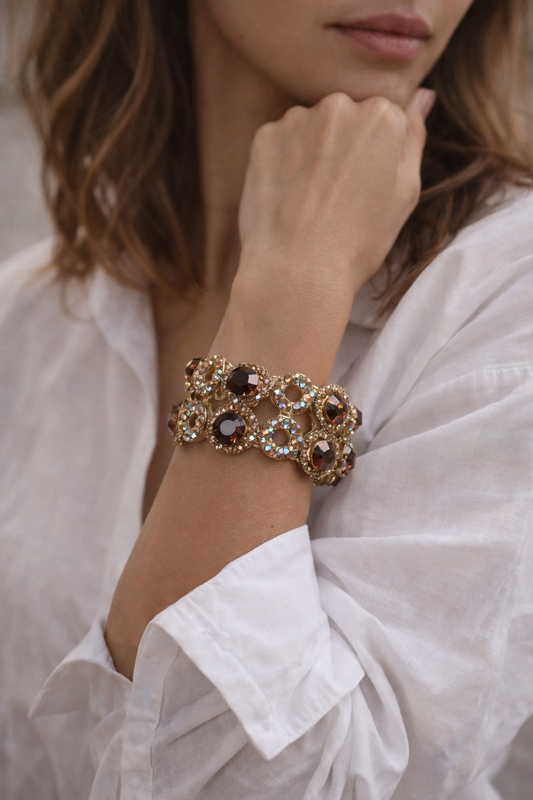 Vintage Aurora Borealis & Amber Rhinestone Stretch Bracelet – Gold Tone Crystal Statement Bracelet