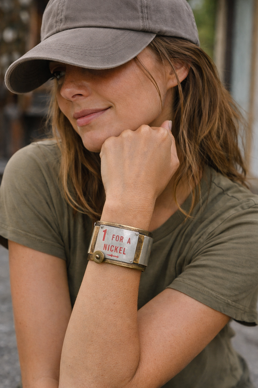 Last Nickel Cuff – Upcycled Vintage Stamp Machine Brass Bracelet with Riveted Industrial Grit