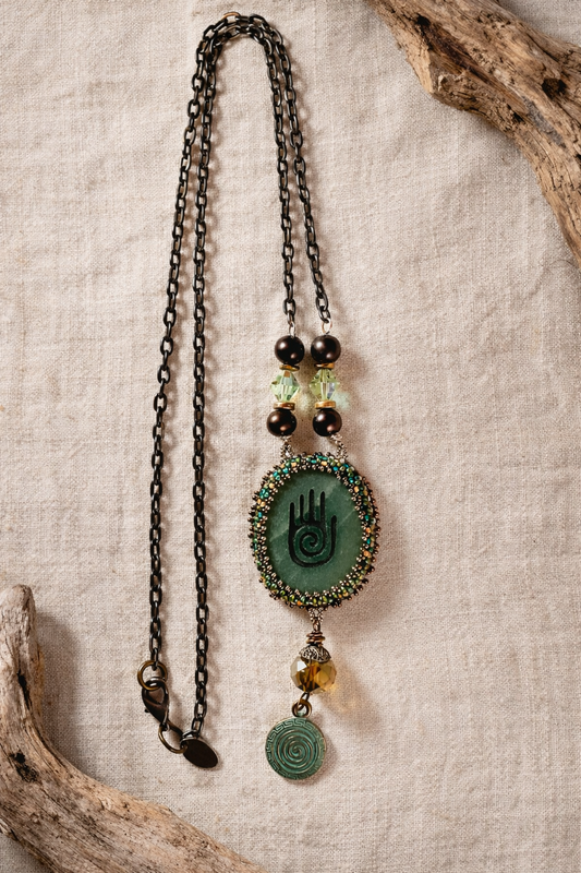 Spirit Hand Malachite Bead Embroidered Pendant Necklace