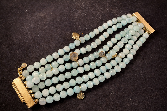 Vintage Six Strand Aqua Bead Charm Bracelet – Sliding Lock Clasp Statement Bracelet