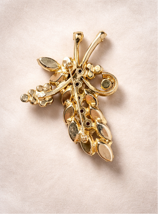 Vintage Amber & Clear Rhinestone Brooch Pin – Gold Tone Statement Floral Spray Brooch