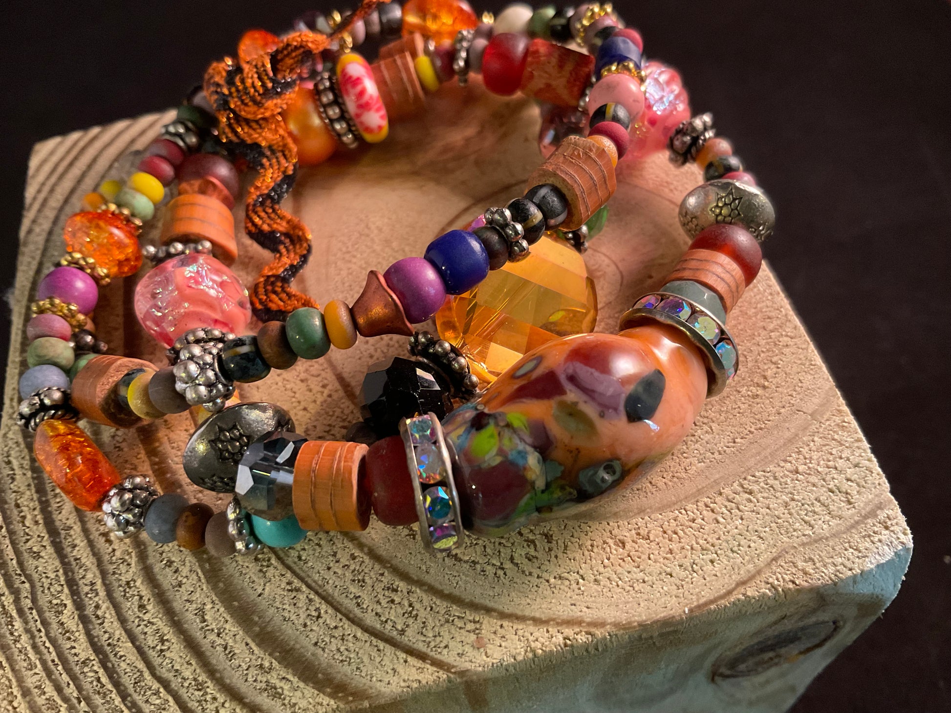 his vibrant three-bracelet boho stack features a spectacular hand-blown glass focal bead surrounded by an eclectic mix of artisan beads including crystals, rondelles, wood, metal spacers, and colorful glass accents.