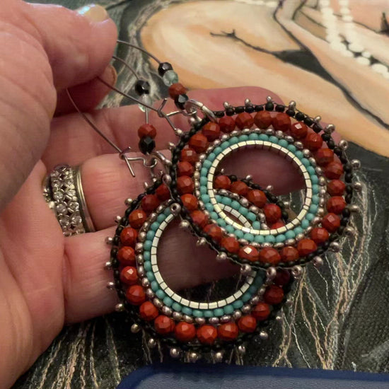 Beaded around silver rings in a brick-stitch. These colors go with almost everything. Czech beads trimmed in black and silver are killer! The kidney wires have more Czech beads and are so light - you won't know you have them on - until all those people comment on how beautiful they are!