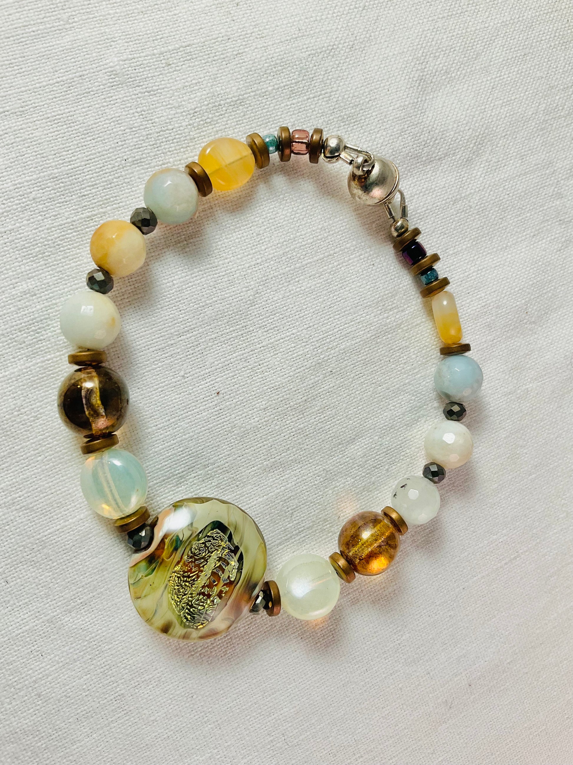 Mesmerizing diachroic glass takes center stage in this stunning 7.5" bracelet, beautifully complemented by luminous moonstone, warm bronze, and earthy jasper accents. The ingenious magnetic clasp snaps securely in place with effortless convenience, making it as practical as it is gorgeous. Perfect for everyday wear or special occasions, this piece combines eye-catching color-shifting beauty with comfortable, hassle-free functionality.