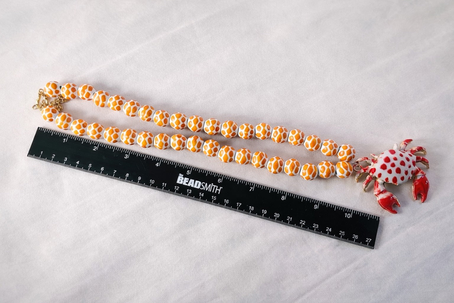 Bright, bold, and full of seaside charm, this handcrafted necklace features vibrant orange-and-white patterned beads paired with a whimsical crab pendant that steals the show. Designed to feel playful yet stylish, this piece brings instant personality to any outfit — from summer dresses to simple tees.