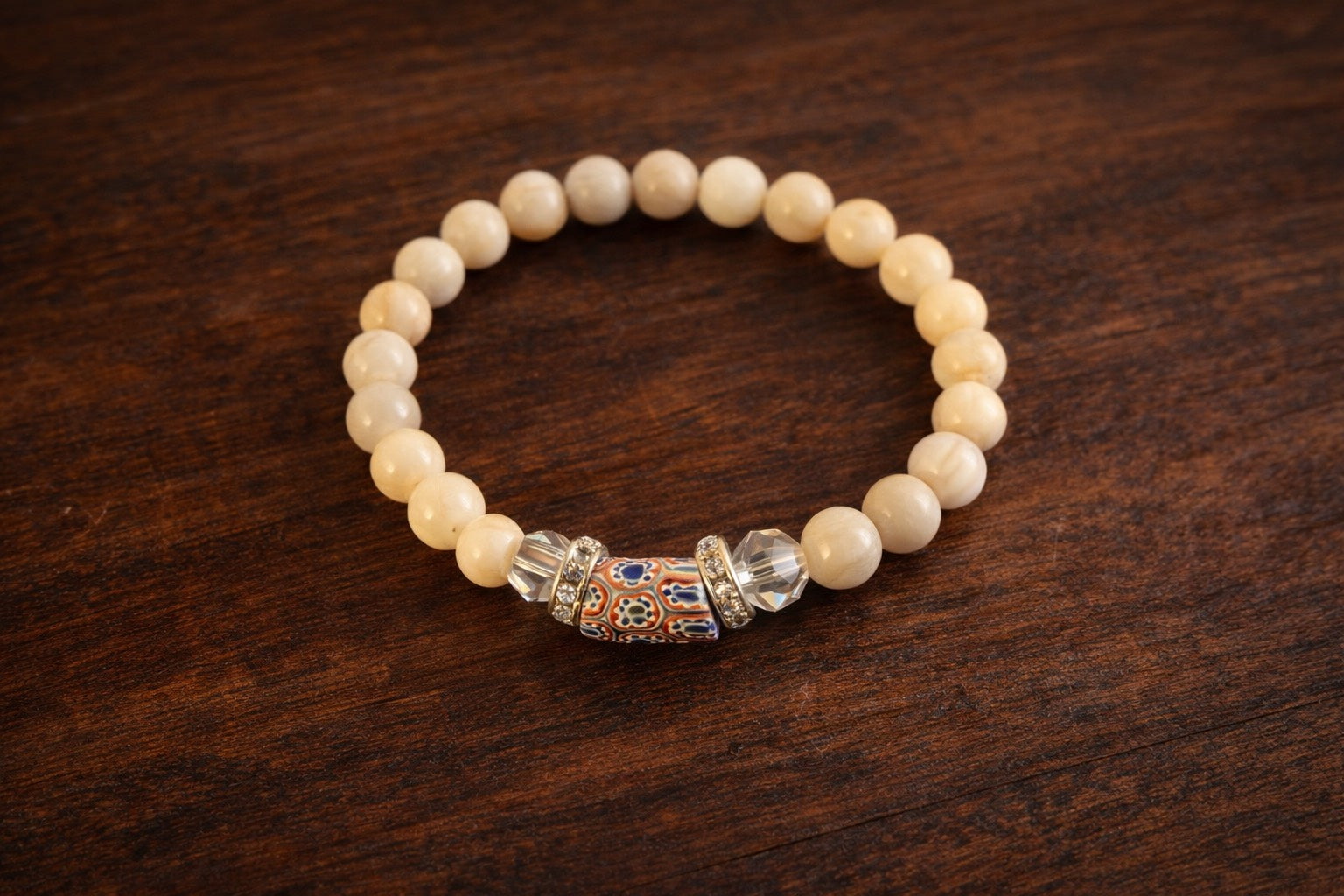 This elastic stretch bracelet features a beautiful mix of smooth jasper beads, premium crystal rondelles, and a striking African focal bead that gives the whole piece its soul. The crystals catch the light just enough to add shimmer, while the jasper keeps it earthy and wearable.