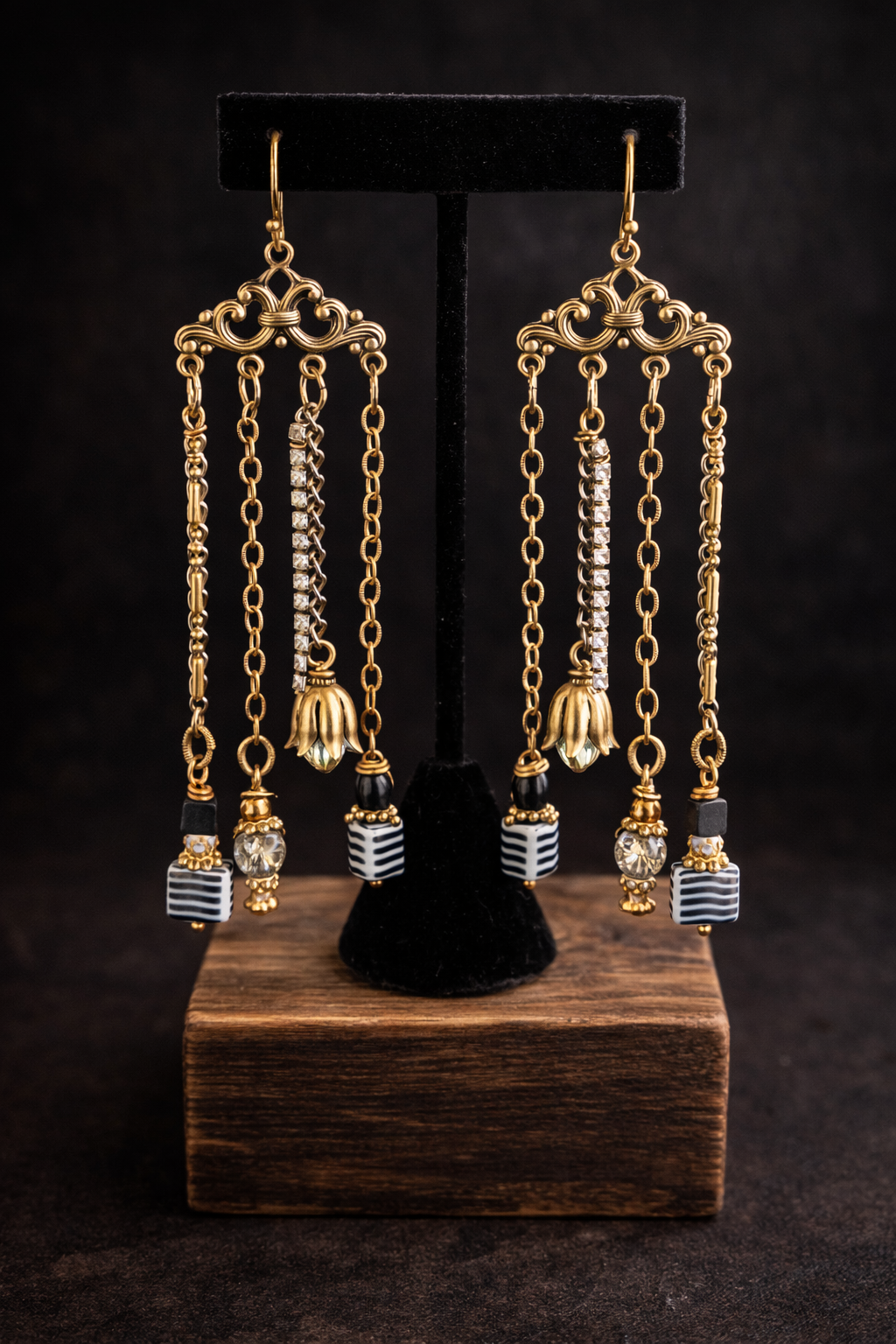 These chandelier earrings feature layered chain and rhinestone fringe, finished with striped beads, vintage crystal accents, and detailed brass bead caps. Full of movement and texture, they catch the light beautifully and make a bold, elegant statement.