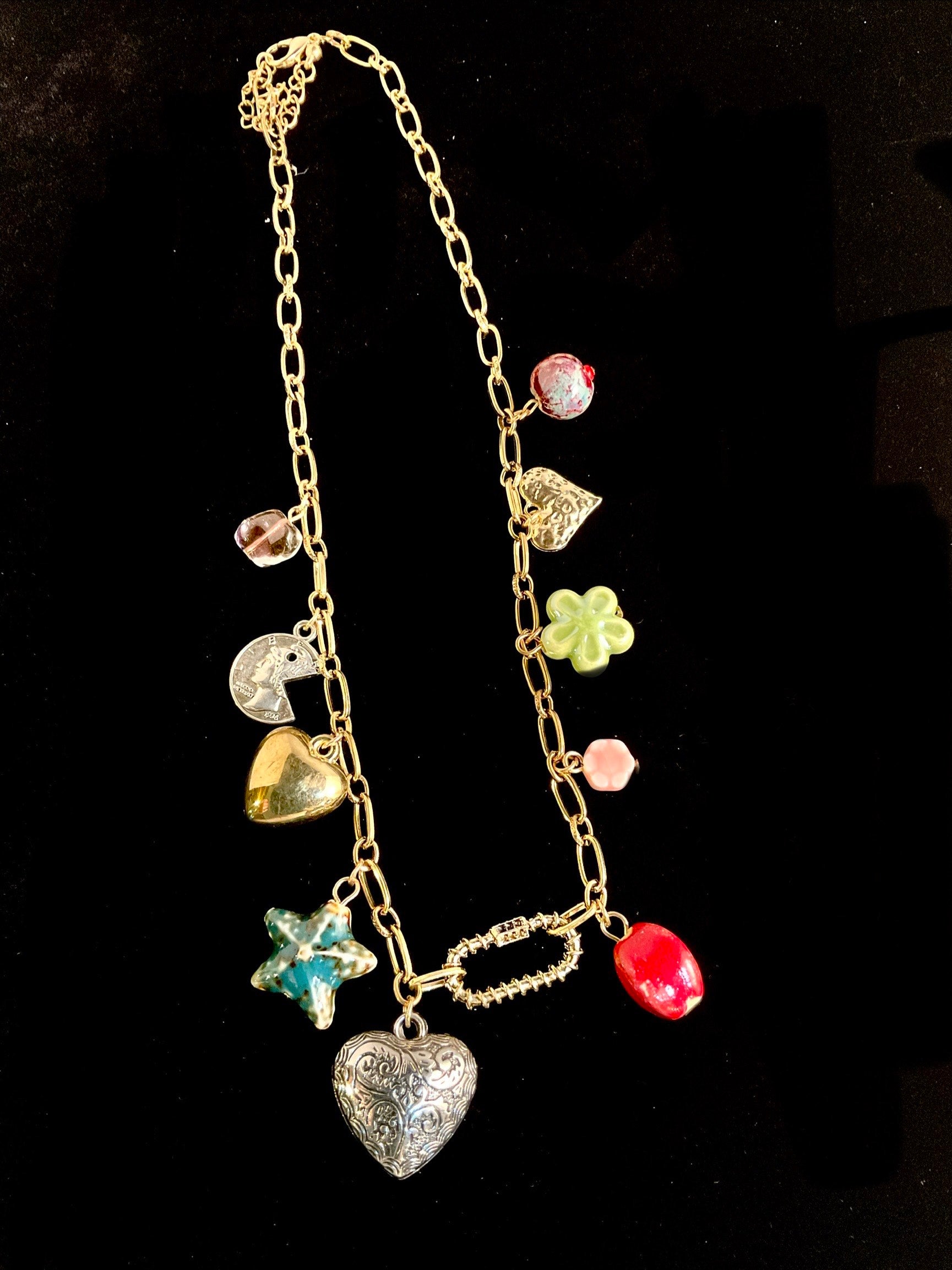 A joyful mix of charms and color, this gold-tone charm necklace features hearts, stars, flowers, and playful glass beads—each one a tiny good-luck moment. Designed to feel collected over time, adjustable, lightweight, and perfect for everyday wear or layering.