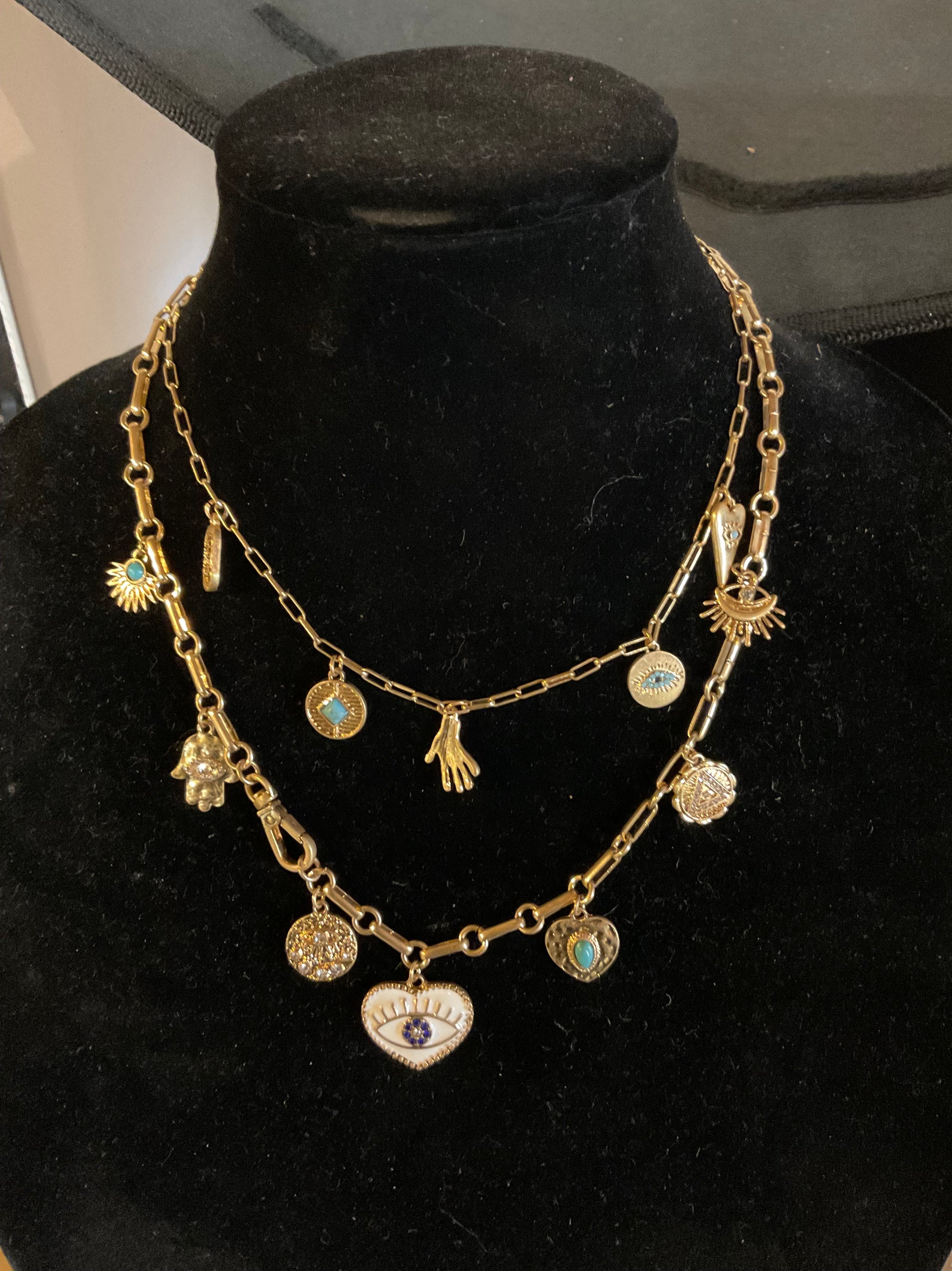 A double-layer 16" and 18" gold charm necklace featuring turquoise accents, celestial motifs, an an all-seeing eye pendant -- radiant, symbolic, and full of bohemian energy.