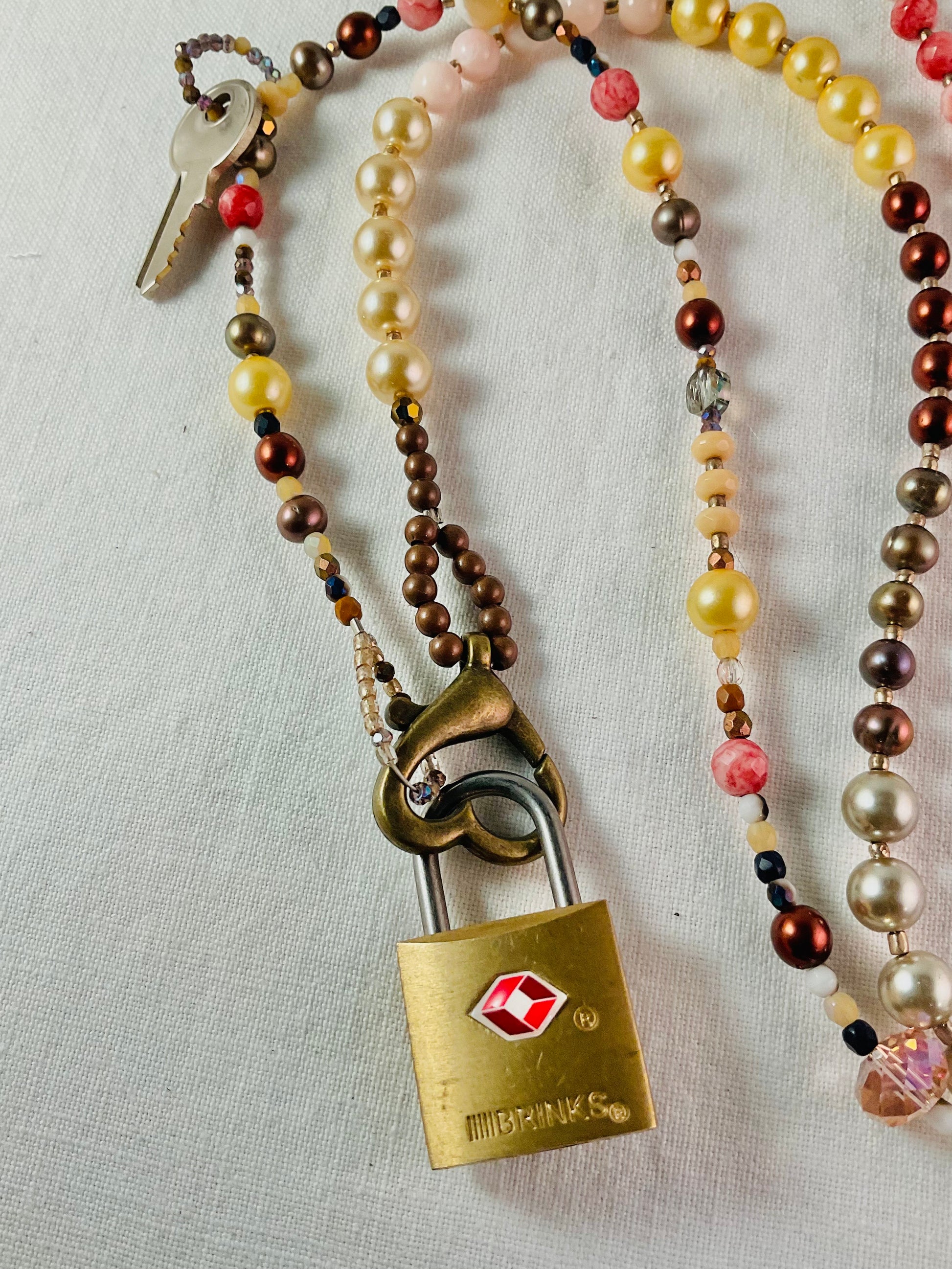 This stunning 40" necklace wraps beautifully around your neck twice, creating an elegant layered look. Crafted with lustrous pearls, shimmering Czech crystals, and earthy Jasper, it combines sophistication with natural beauty. The centerpiece features a real, functional lock with an accompanying key—the lock detaches for versatility, while the key remains a permanent part of your design. Perfect for expressing devotion or treating yourself to a piece that's as meaningful as it is gorgeous. A conversation starter that celebrates love in style.
