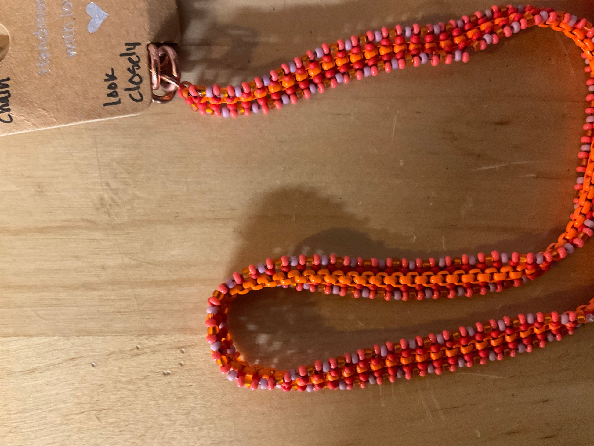 Handcrafted with vibrant orange and lavender seed beads, this 20" beaded chain brings a pop of color to any outfit. Each bead is carefully placed by hand, creating a unique piece that's as fun to wear as it is to admire. Want to make it even more special? Add your favorite pendant to personalize your look. Perfect for layering or wearing solo, this playful necklace celebrates bold, cheerful style.