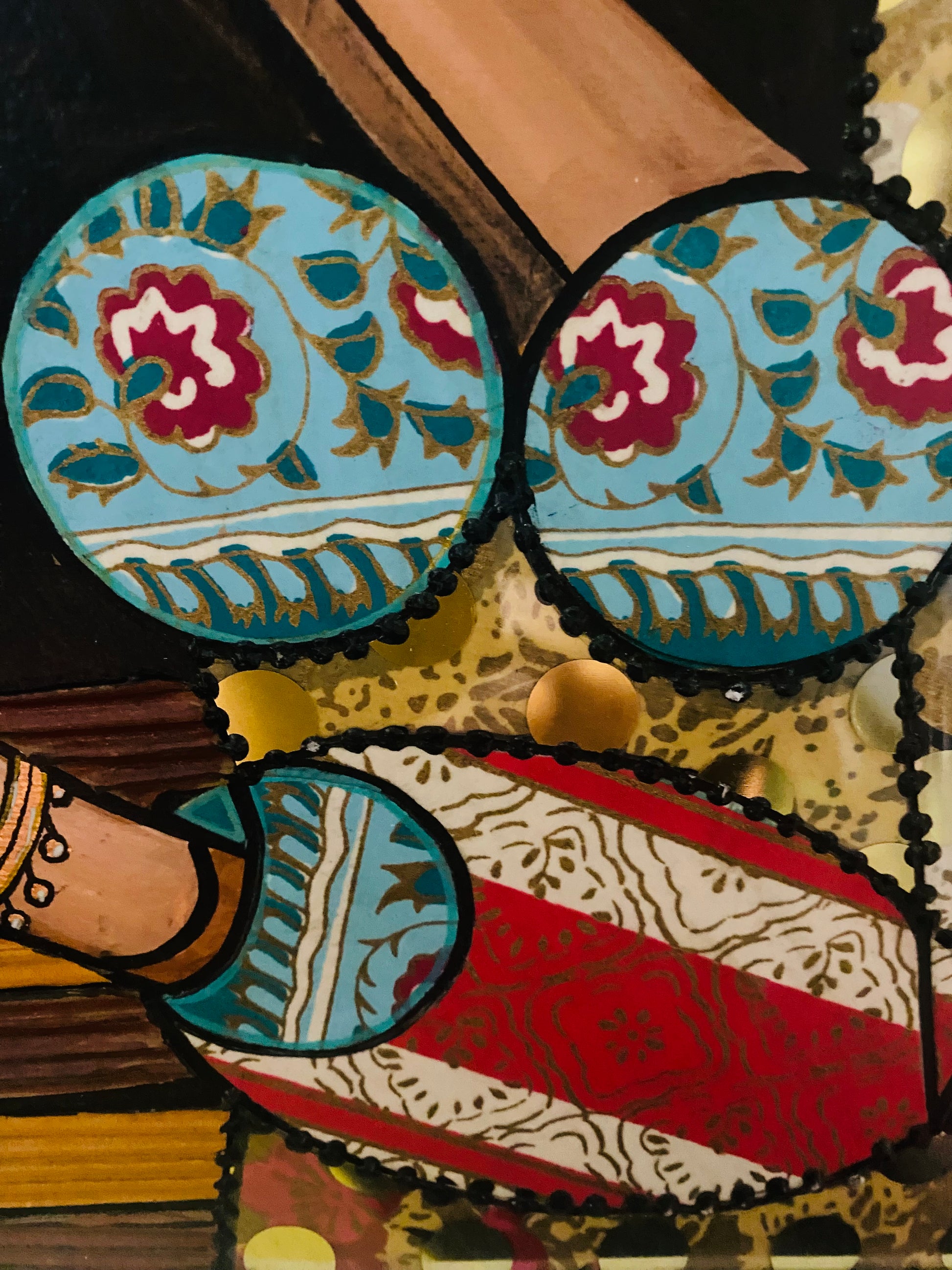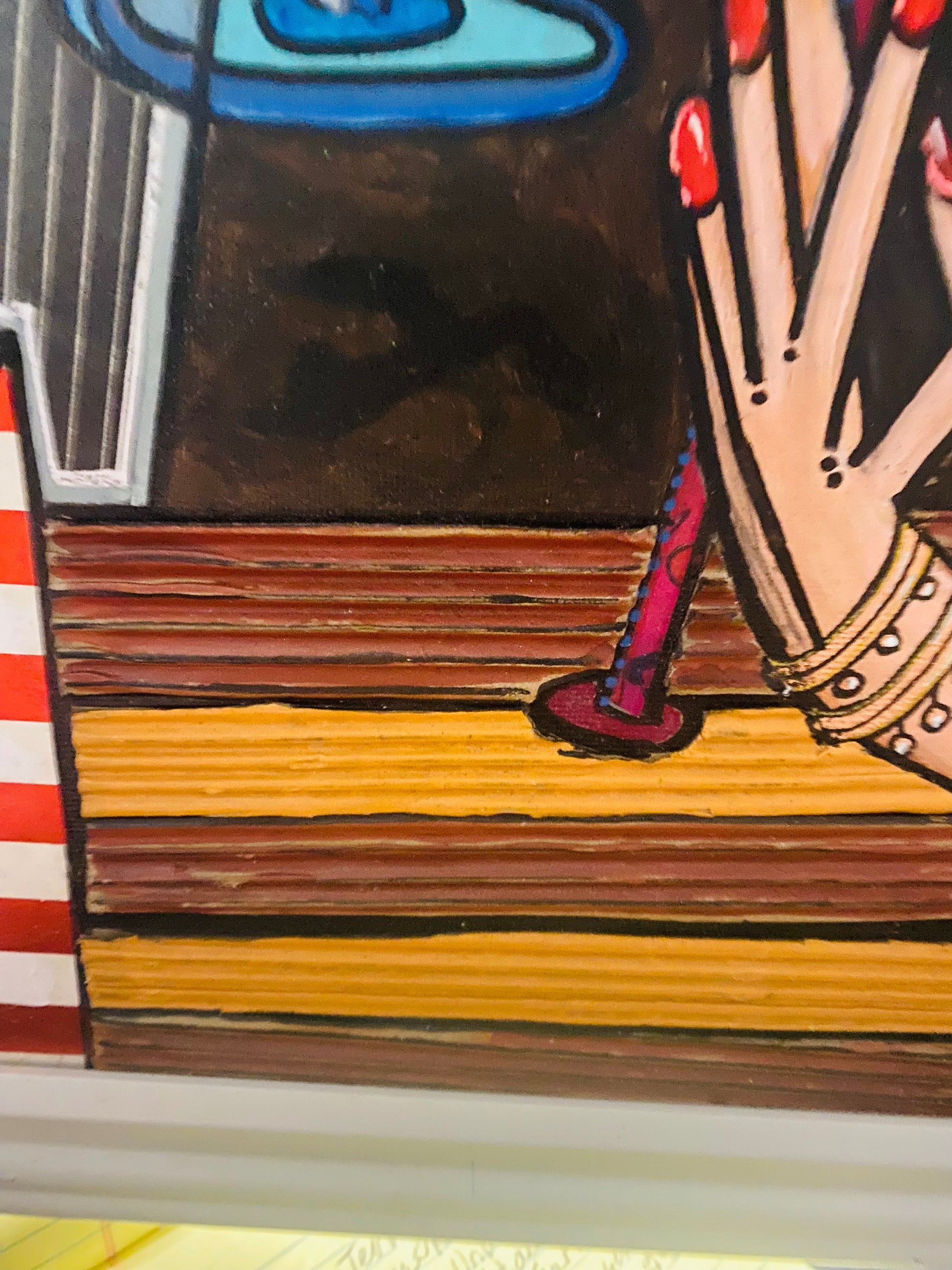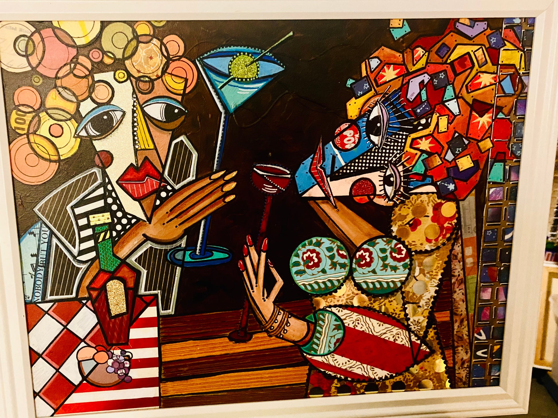 Picture the butterflies, the nervous laughter, the candlelit glow—this mixed-media painting captures that magical first date moment in all its romantic glory. Crafted with an eclectic blend of materials including mixed papers, acrylic paint, gel pen, and corrugated cardboard, this piece layers texture and dimension to bring the scene to life. Each element adds depth and character, creating a whimsical celebration of new love. Perfect for anyone who believes in the power of a perfect first impression—or just loves a good love story.