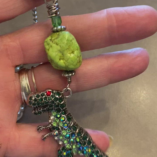 This T-Rex necklace is all about the fun...the pendant is 5" overall on an 18" silver ball chain. A green stone sits above his head with hand stamped ROARRRR washer. Ball chain has some different fun sparkle to it...all in all, a conversation starter to be sure.