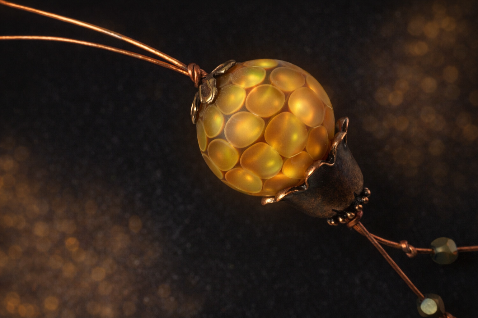 A one-of-a-kind statement piece featuring a rare hand-blown artisan glass bead (nearly $100 bead alone), capped in warm copper and suspended from a 24” leather cord. Finished with hammered metal cross accents for a bold, soulful edge.
