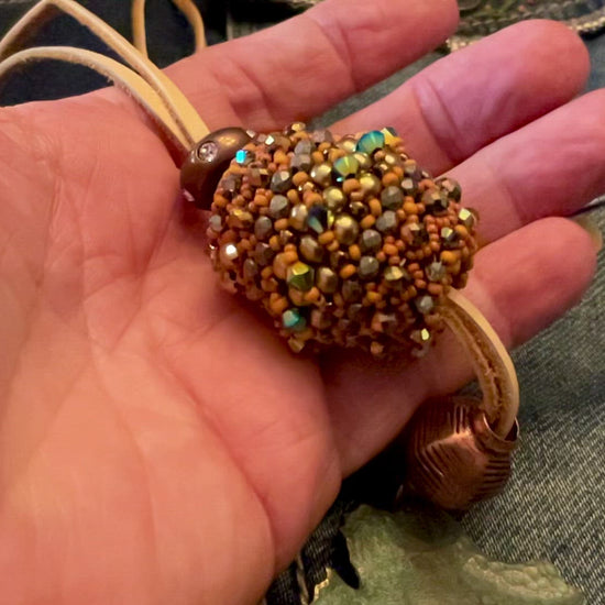I love to make these big beads...not only are they fun to make, they are simply beautiful. The bead is hand sewn over a large wooden bead starting with the middle first and working my way out to then top and bottom. It is covered in quality precious crystal beads, Czech and seed beads.