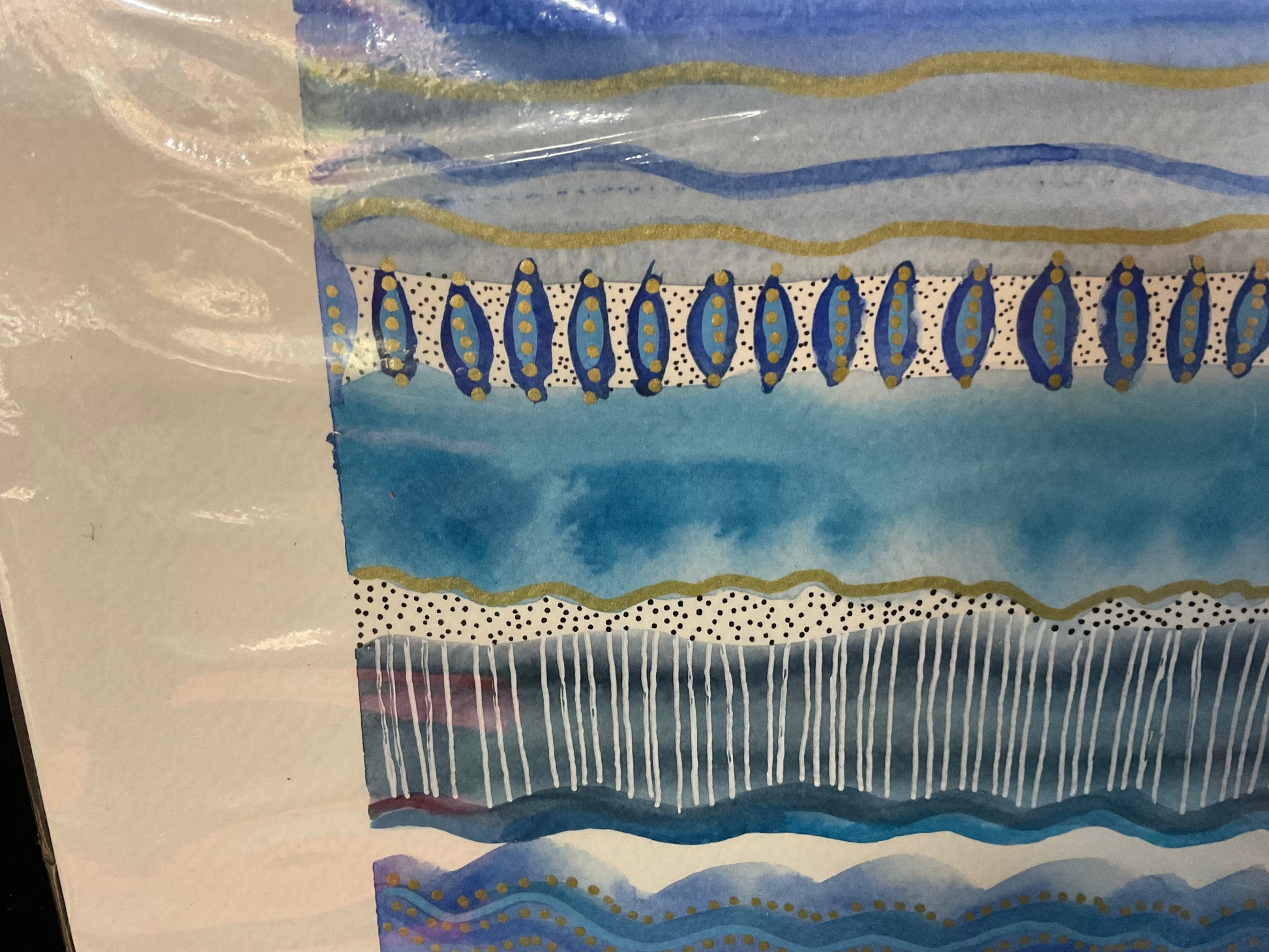 This original watercolor, pen, and ink artwork explores repetition, rhythm, and movement through layered horizontal bands of pattern and color. Rich blues, soft washes, and delicate gold accents flow across the page, each section offering its own unique texture and detail.
