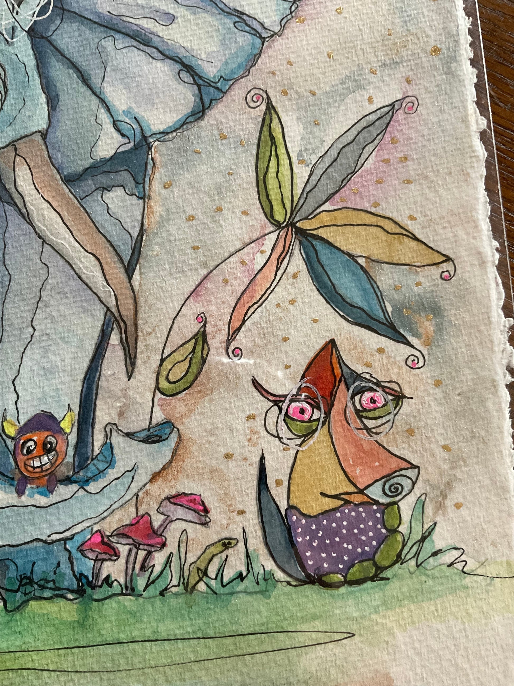Make your walls pop with the quirky and fun Watercolor - Ellie & Picasso original. This piece features watercolor, ink, and gold pen on high-quality paper, measuring 11' x 15". Plus, with Ellie wearing a rose headband and her friend Picasso (and another hidden friend), this unique artwork will bring a touch of humor and whimsy to any room.
