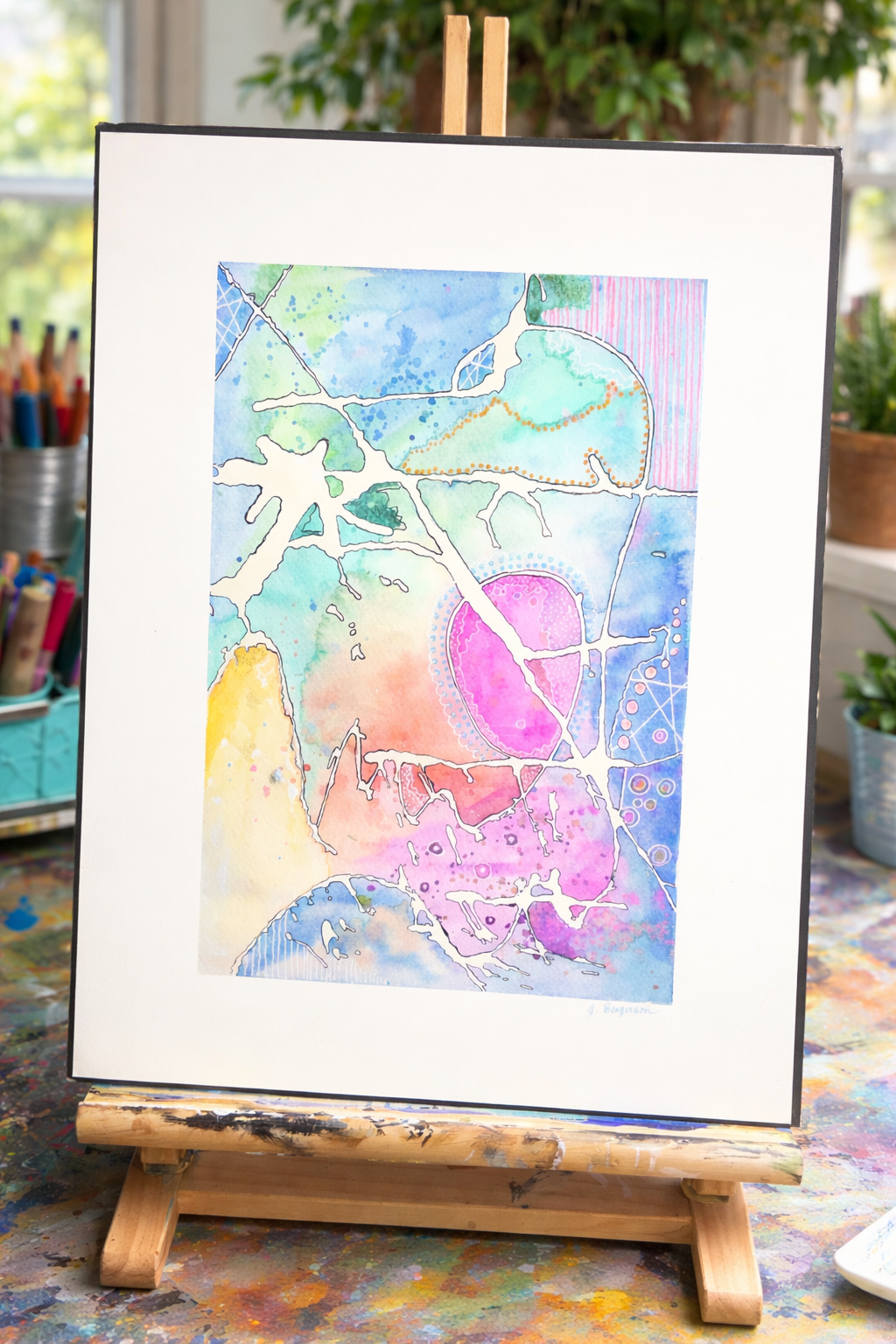 An abstract exploration of movement, connection, and soft boundaries, this original 11” x 15” watercolor and pen piece blends fluid washes of color with delicate linear pathways. Layers of turquoise, blush, lavender, and golden tones drift and intersect, creating a sense of both structure and spontaneity—like a map of moments unfolding.