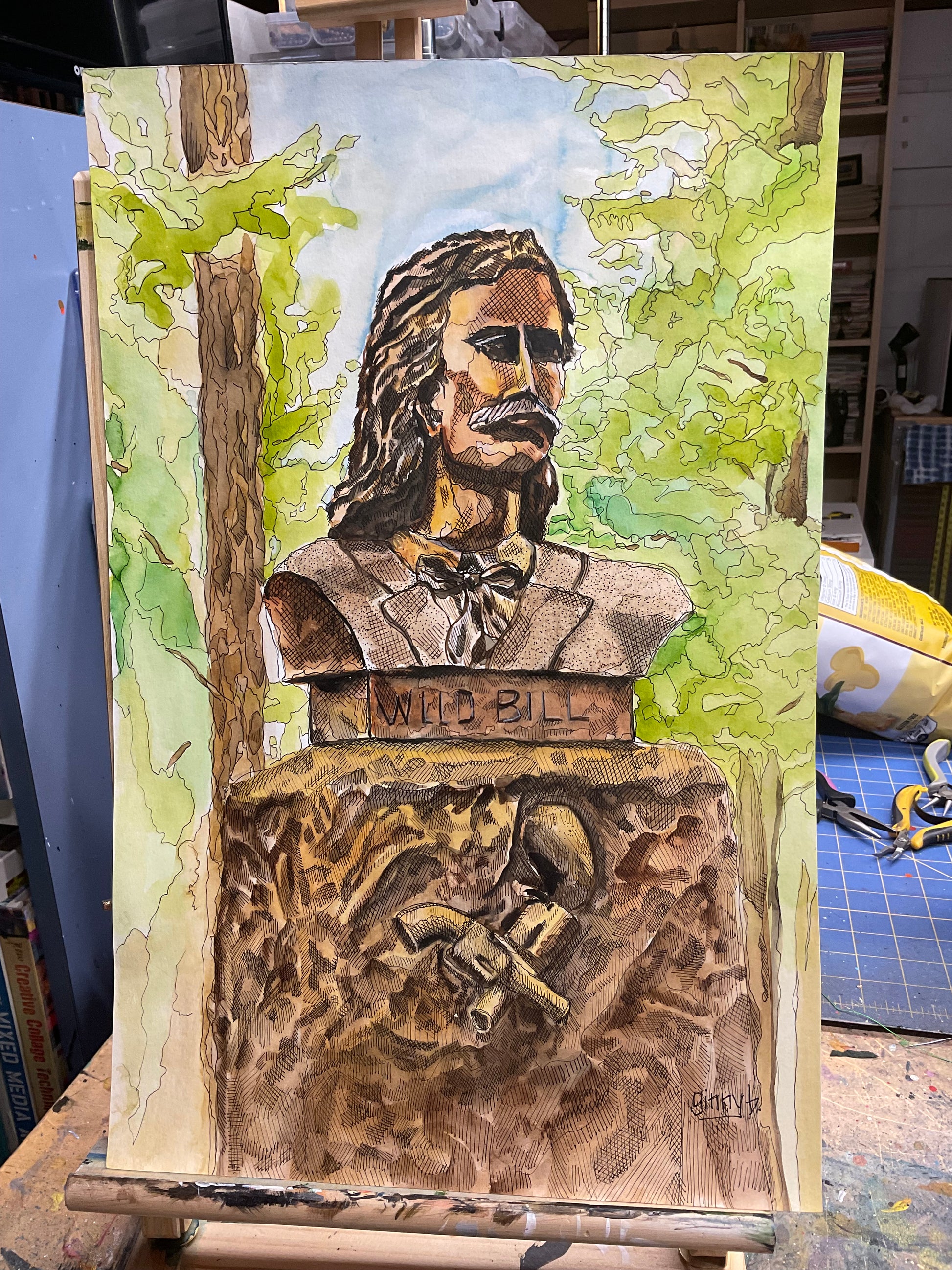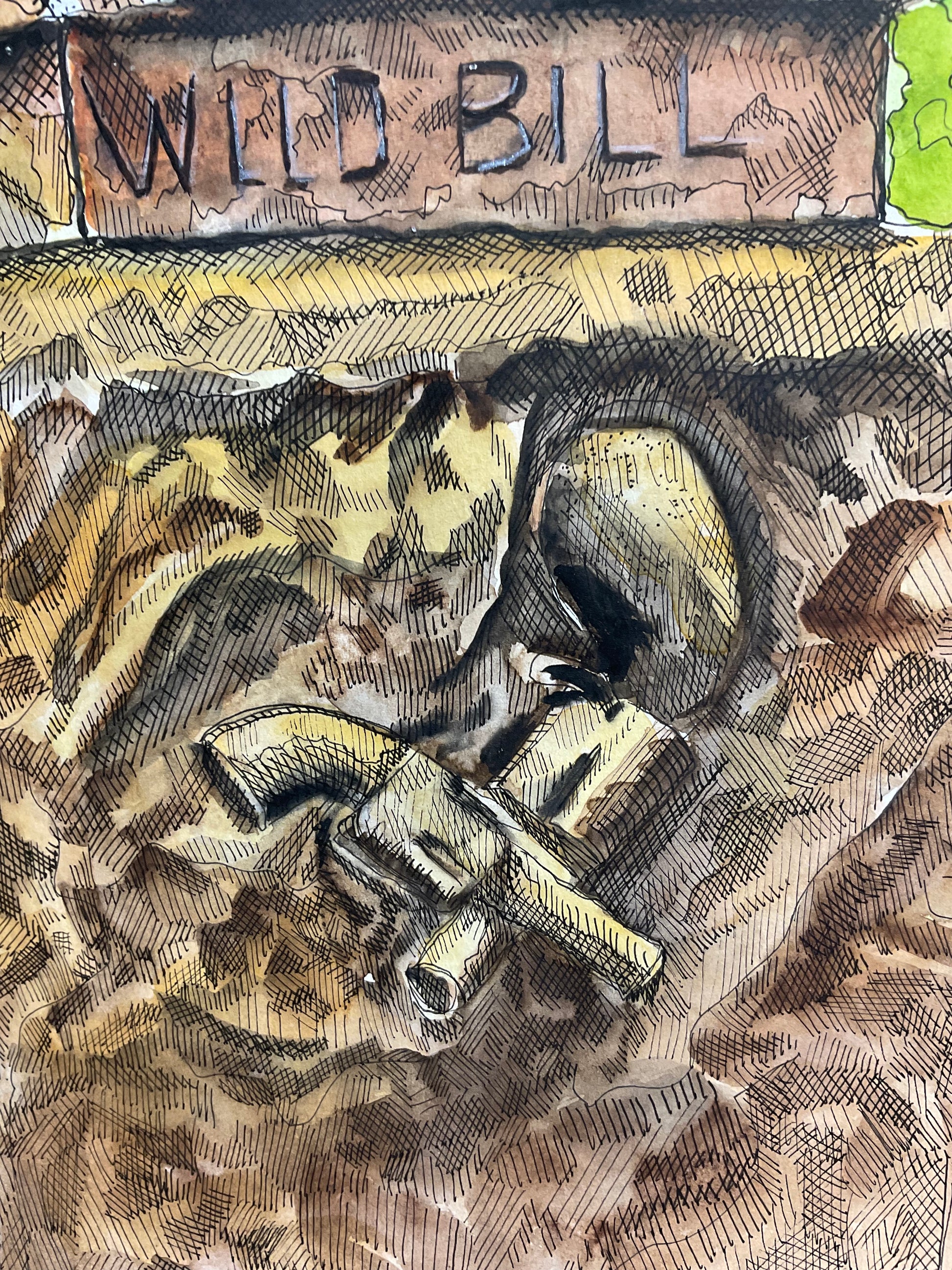 Captured on location in historic Deadwood, South Dakota, this original pen & ink and watercolor brings the legend of Wild Bill Hickok to life through layered texture and storytelling detail.