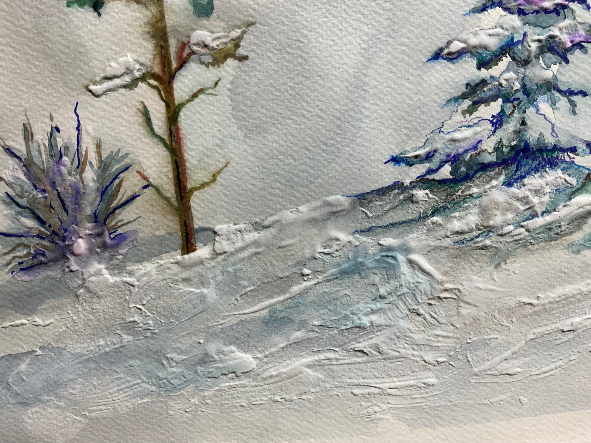This 11 x 15 original painting was created using watercolor with textured mixed-media accents, giving the snow subtle depth and dimension. The layered textures and delicate brushwork make the scene feel both calm and atmospheric.